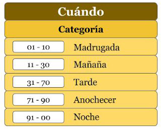 Esta tabla se refiere al momento del día en el que se produce el encuentro, y será necesario tener en cuenta el ciclo de vida de las criaturas que formen parte del encuentro. Si por ejemplo una criatura es nocturna, el encuentro debería producirse normalmente durante la noche.
